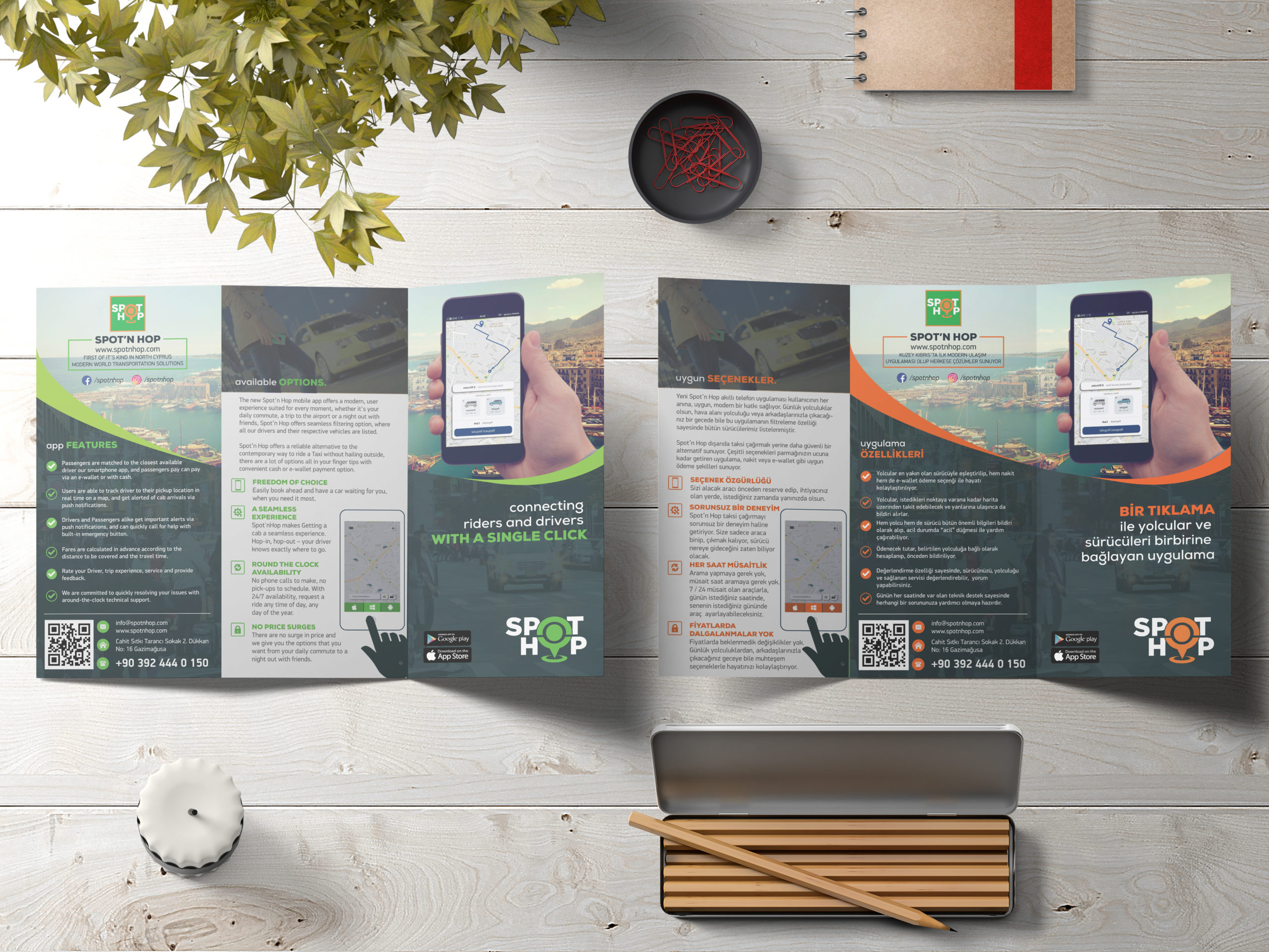This is a bilingual Tri-fold brochure designed as part of a branding project for a cab hailing startup application. The design was made on Adobe Illustrator, I used small color variations to differentiate the design.